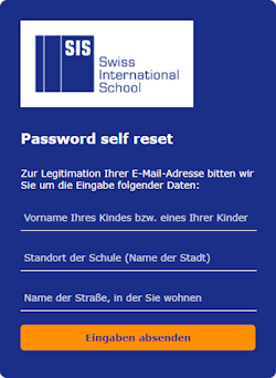 Wenn Sie Ihre Anmeldedaten für das Elternportal oder den Webshop von SIS verloren haben, können Sie das Password Self Reset Tool der SIS verwenden, um ein neues Passwort zu setzen oder Ihren Benutzernamen herauszufinden.