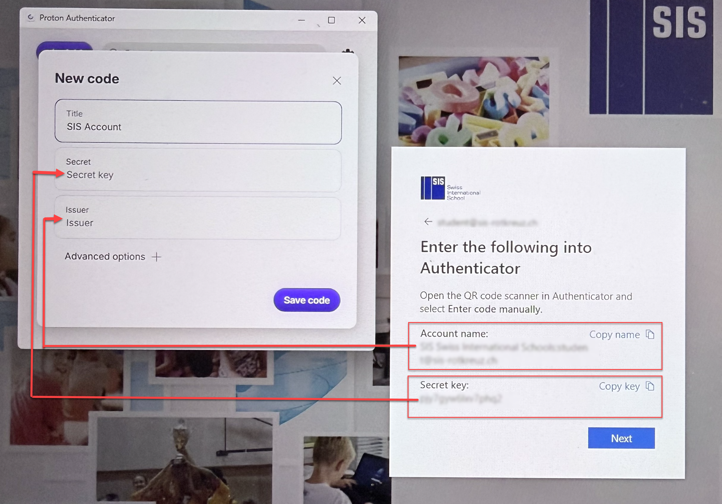 Copy "Secret Key" and "Issuer" into Authenticator App